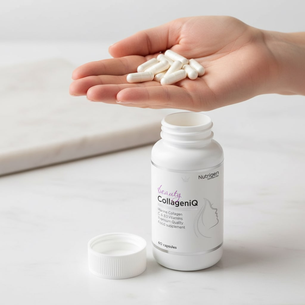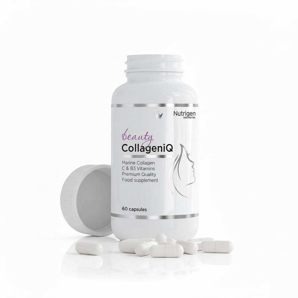 Odmłodź swoją skórę od wewnątrz dzięki CollageniQ – suplementowi urody klasy premium, stworzonemu do walki z oznakami starzenia. Formuła oparta na 100% czystym, naturalnym kolagenie dostarcza organizmowi niezbędnych składników budulcowych potrzebnych do utrzymania młodej i pełnej blasku cery. Wraz z wiekiem naturalna produkcja kolagenu spada, co prowadzi do powstawania drobnych linii i utraty jędrności; CollageniQ uzupełnia te niedobory, skutecznie wygładzając powierzchnię skóry.